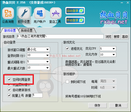 :主程序里空闲时登录打钩。