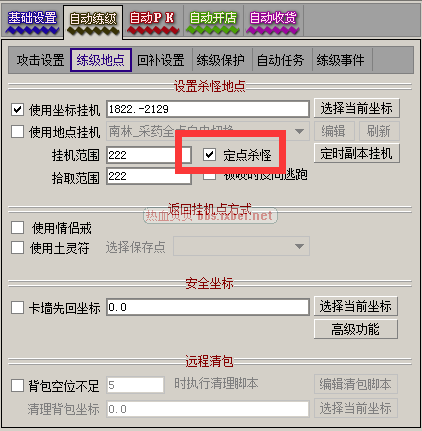 定点打怪是收费挂功能,充值后选择自动练级---挂机地点---定点杀怪勾一下即可。
