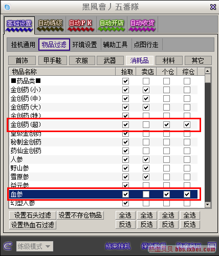 不是可以添加的吗,把你要用的药添加进去,其它药则自动存仓了,前提是不要勾“红蓝药”