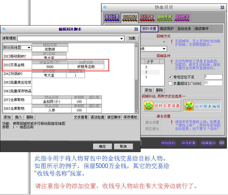 热血贝贝1.37版本新增【交易金钱】指令