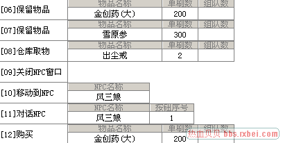 回补设置 回补脚本编辑在保存物品下面就是关闭NPC窗口前面插入 仓库取物 命令 出尘戒 1或者2个