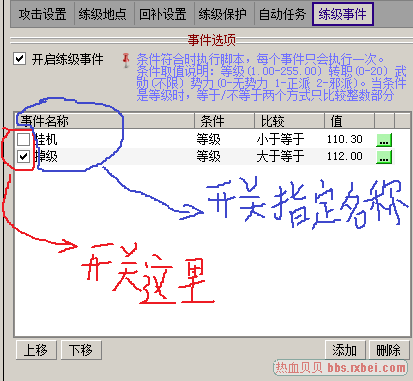 然后你在掉级文件里设置好掉到一定级别就读取你挂机的文件.很简单的.我10多个号都这样设置.简单有效 .设置完了就不用管了.不需要设置开关的 |