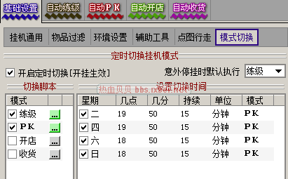 练级和PK设置可以设置买药和仓库取装备换装备操作,势力战我提前10分钟去待命,如果报名过了5分钟依然没进去肯定就进不去了,PK扩展里超时未进停挂打勾设置20分钟,超时没进去停挂会自动切换到练级模式去挂机,已经进入义斗关的号会继续杀人或者打BOSS,直到势力战结束,结束后自动回去挂机