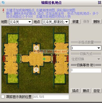 还有一个最关键的是势力战挂机地点设置,不能设置临时坐标,只能设置挂机地点,我教大家如何设置地点,在挂机点选择编辑,调取出义斗关地图,按新建,鼠标在地图上滑动,选中你需要挂机的地点左键点一下,编辑一个名称,然后按保存,这个地点就保存下来了,本机电脑挂机的其他人物都可以使用这个挂机点