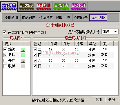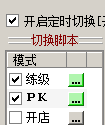 1、PK扩展页面超时未进停挂打勾,设置一个时间,当遇到报名人数过多无法进入义斗关时能自动停挂,自动切换回练级开店或者收货模式 2、PK扩展页面强制进势力打勾 3、PK扩展页面战斗结束时停挂 附图自动切换模式页面设置:大家可以根据自己参加的势力时间修改,有人会有疑问为什么我设置持续时间是15分钟,因为我从50分开始切换的,15分钟之后就是报名后5分钟了,这时如果进去不去义斗关就进不去,安心回去挂机吧 图示切换脚本下面有2个绿色的方框,这里可以编辑买红蓝,更换武勋装备,换披风等等,根据个人需求设置就可以了 图片:QQ图片20160505144716.png |