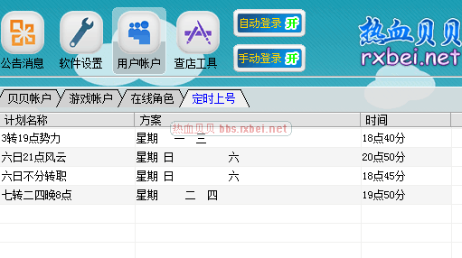 这个比较简单,只需在贝贝主程序--定时上号设置上线计划就可以了,然后在游戏账户定时选项里选择你设置的计划时间 除了上一贴3条注意事项打勾之外,切记:环境设置里自动停挂退游戏打勾,(这个不打勾不会自动下号) 图片:QQ图片20160505144730.png ![]() 图片:QQ图片20160505144735.png |