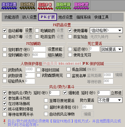 图片:QQ图片20160505144724.jpg ![]() 19.0版本之后势力战特别注意以下几点: 1、用户可以设置在对练场参战,PK扩展页面“在对练场接战”打勾 2、“参加风云/势力 ”打勾, 延时参加(秒),默认0,不要改动 3、“强制进”打勾 延时(秒),设置0 以上操作仅在开挂状态下有效。 图片:QQ图片20200710125204.png |