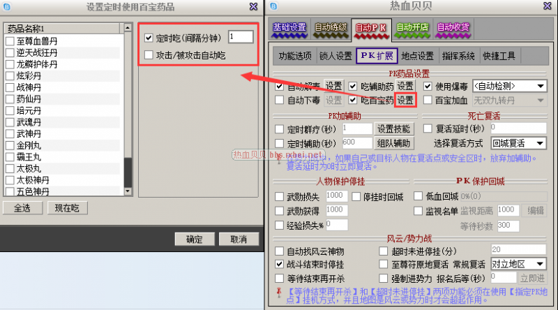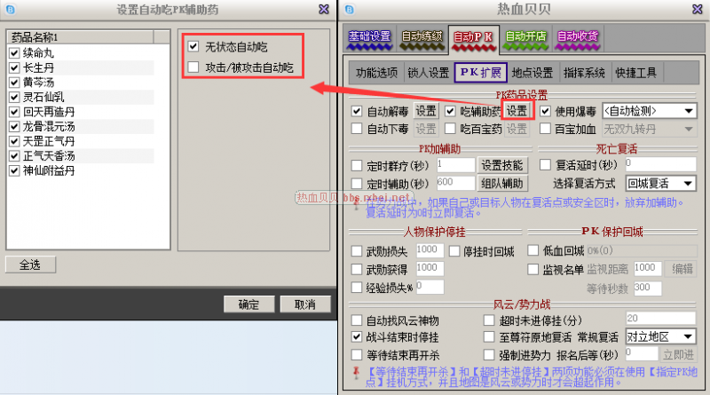 贝贝2.83版本PK模式攻击/被攻击时吃辅助药和百宝药