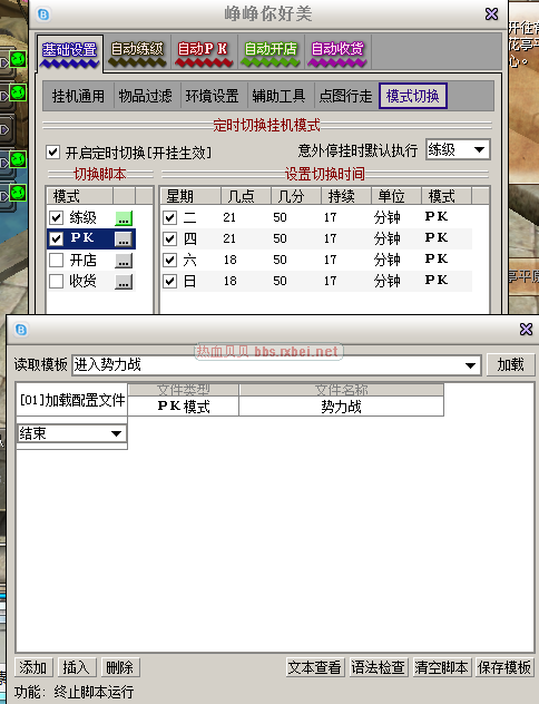 ======================================= 你上面这段可以省略 直接弄好你在势力时的个人配置就可以了 指定时间自动切换就可以 到了指定时间贝贝会从你挂机地点自动切换脚本/个人配置去银币广场等候势力的 |