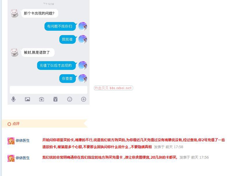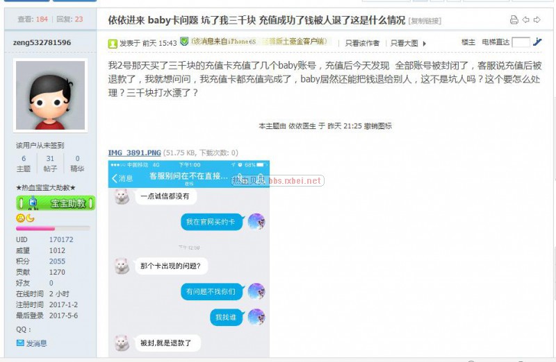 向baby客服人员咨询为何会被封,对方给出的说法是:被退款了。 但baby官方上面明确的说明不接受7天无理由退款。试问为何会被退款成功呢? 所有卡号均以充值成功,成功后三天,baby把3000元款项退给别人封我账号! 现baby客服不处理这个问题,在baby论坛上发贴,被删除 还望贝贝管理帮忙反映此问题, |