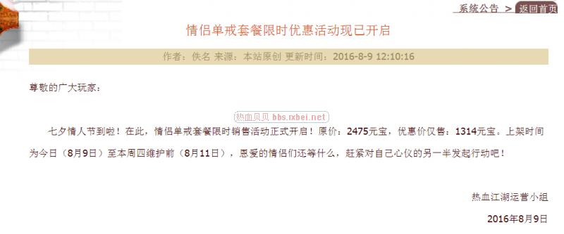 就是这个,你看,都快两年没有出过这个活动了,上次还是16年8月出的。 图片:QQ截图20180121095826.png http://rxjh.17game.com/news/gonggao/201608/60474.htm |
